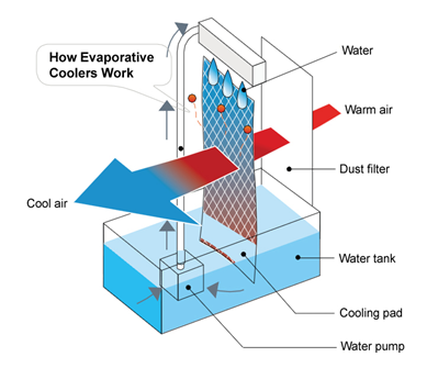 Evaporative cooling is a very simple air moving system pulls fresh outside air and drives it through the wetted cooling pads. The water in the cooling pads evaporates, bringing down the temperature of the air passing through the cooling pads. The blower then blows the cool air into the room.
